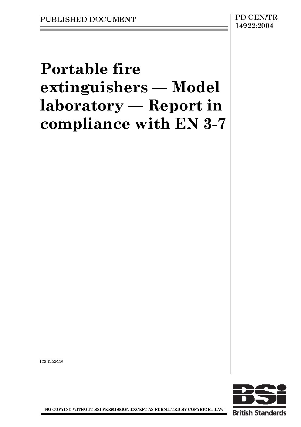Portable fire extinguishers. Model laboratory. Report in compliance with EN 3-7