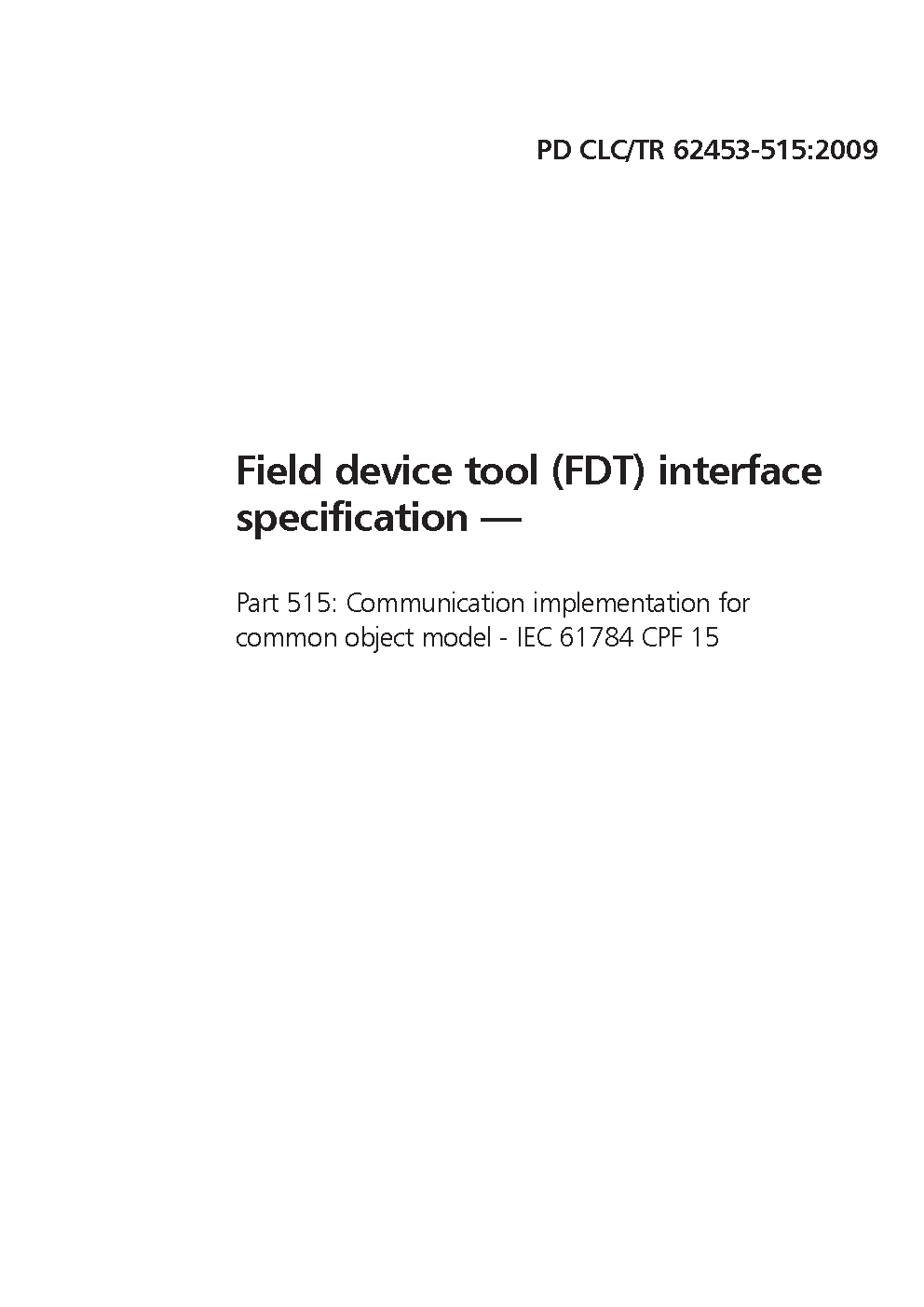 Field device tool (FDT) interface specification Communication implementation for common object model. IEC 61784 CPF 15