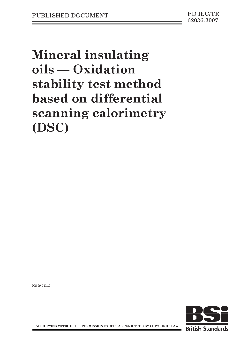 Mineral insulating oils. Oxidation stability test method based on differential scanning calorimetry (DSC)