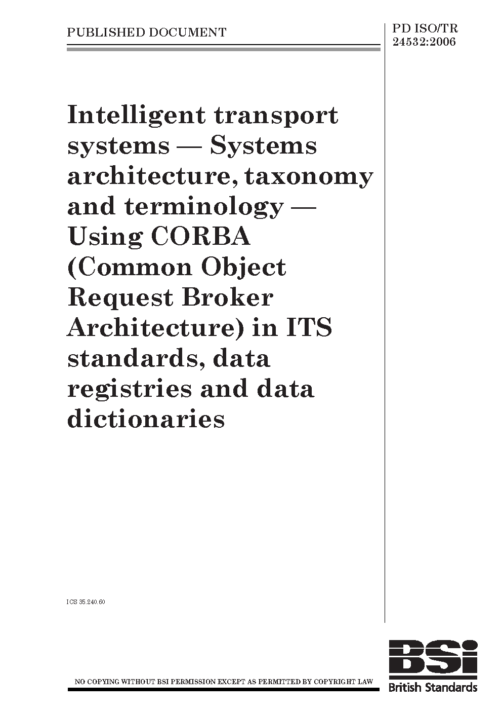 Intelligent transport systems. System architecture, taxonomy and terminology. Using CORBA (control object request broker architecture) in ITS standards, data registries and data dictionaries