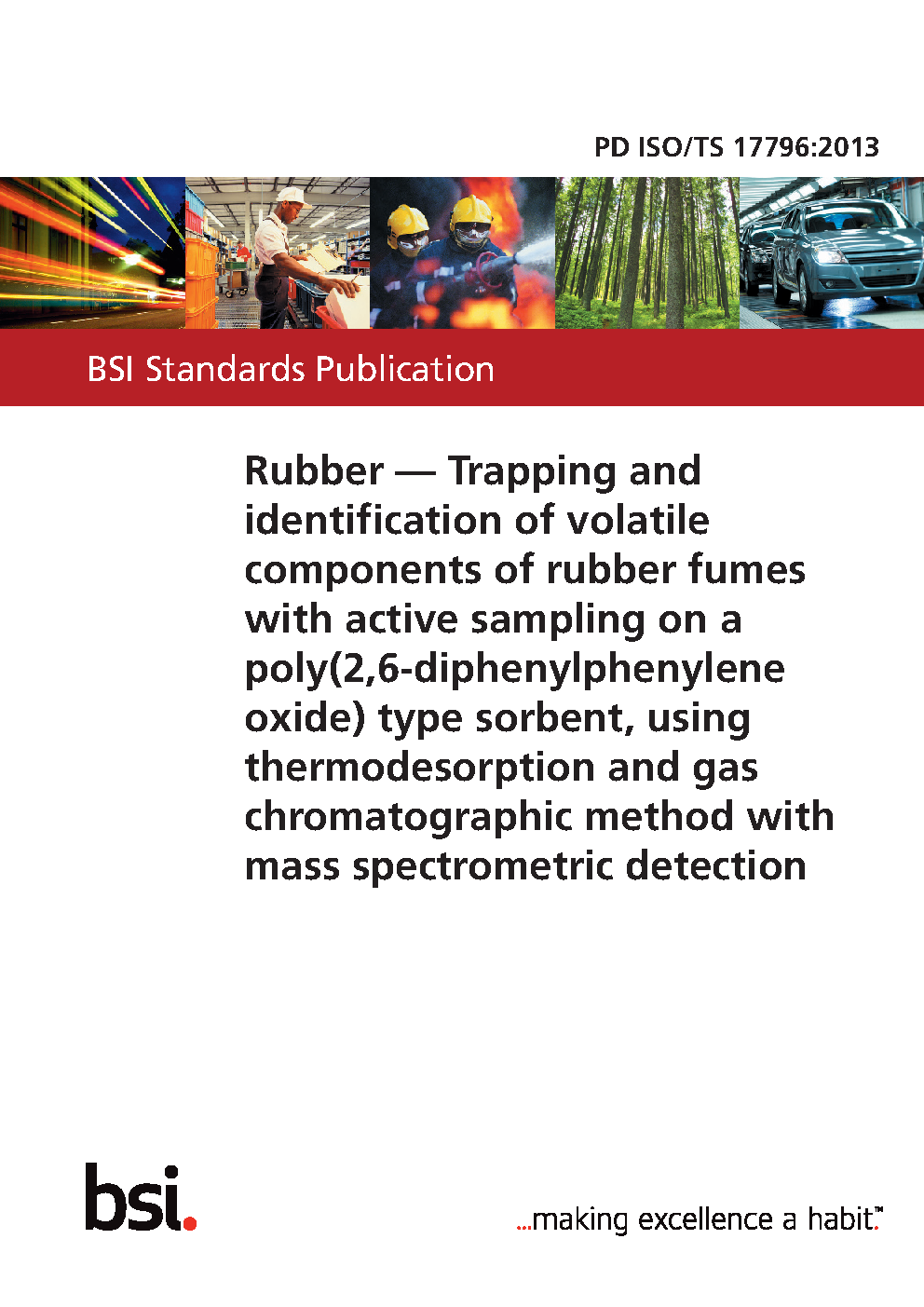 Rubber. Trapping and identification of volatile components of rubber fumes with active sampling on a poly(2,6-diphenylphenylene oxide) type sorbent, using thermodesorption and gas chromatographic method with mass spectrometric detection