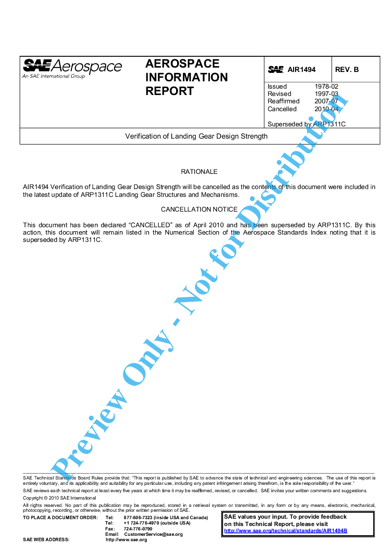 Verification of landing gear design strength is accomplished by dynamic and static test programs. This is essentially a verification of the analytical procedures used to design the gear. An industry survey was recently conducted to determine just what analysis and testing are currently being applied to landing gear. Timing in relation to first flight of new aircraft was also questioned. Opinions were solicited from designers of the following categories and/or types of aircraft: a. military - large land based (bomber); b. mililtary - small land based (fighter); c. military - carrier based (Navy); d. military - helicopter (large); e. military - helicopter (small-attack); f. commercial - large (airliner); g. commercial - small (business); and h. USAF (WPAFB) - recommendations. It is the objective of this AIR to present a summary of these responses. It is hoped that this summary will be useful to designers as a guide and/or check list in establishing criteria for landing gear analysis and test.