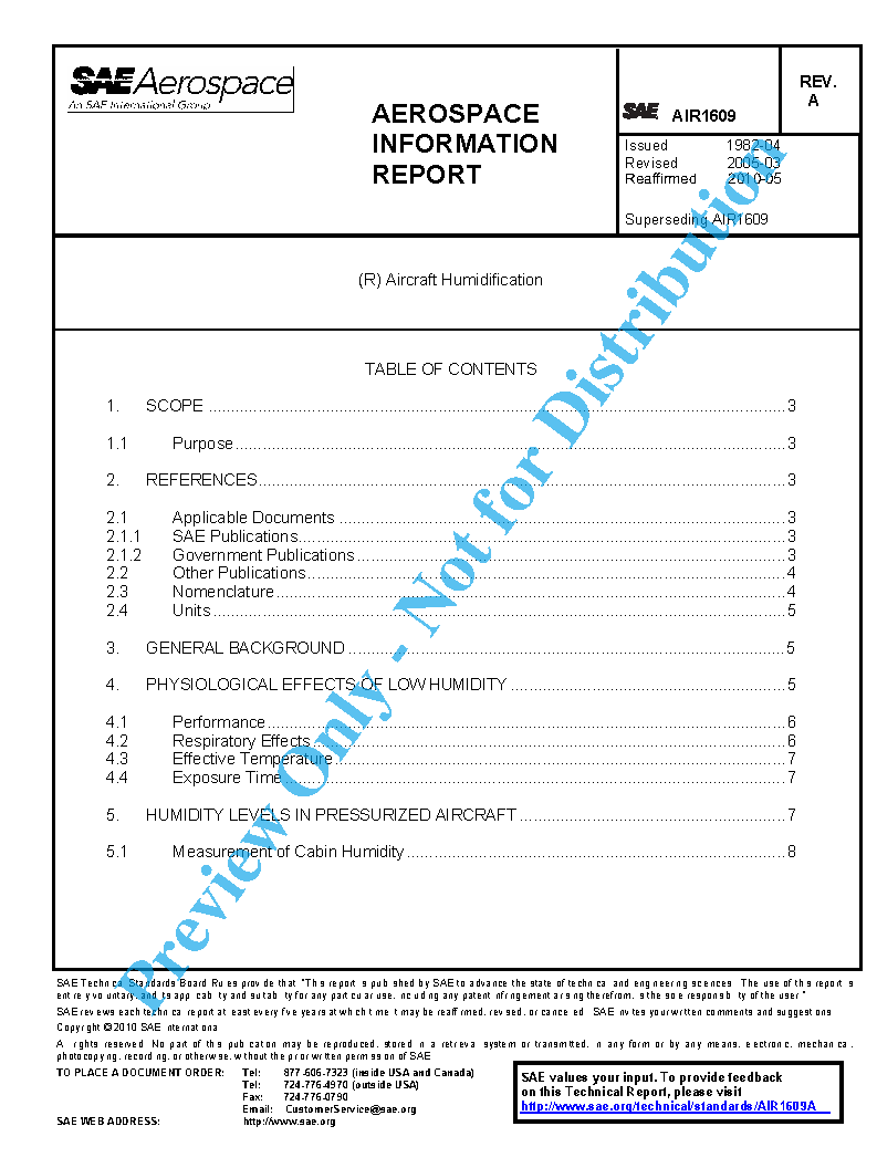 This SAE Aerospace Information Report (AIR) covers the design parameters for various methods of humidification applicable to aircraft, the physiological aspects of low humidities, the possible benefits of controlling cabin humidity, the penalties associated with humidification, and the problems which must be solved for practical aircraft humidification systems. The design information is applicable to commercial and military aircraft. The physiological aspects cover all aircraft environmental control applications.