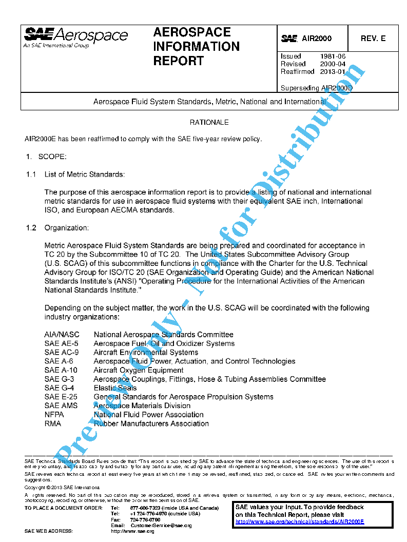 The purpose of this aerospace information report is to provide a listing of national and international metric standards for use in aerospace fluid systems with their equivalent SAE inch, International ISO, and European AECMA standards.