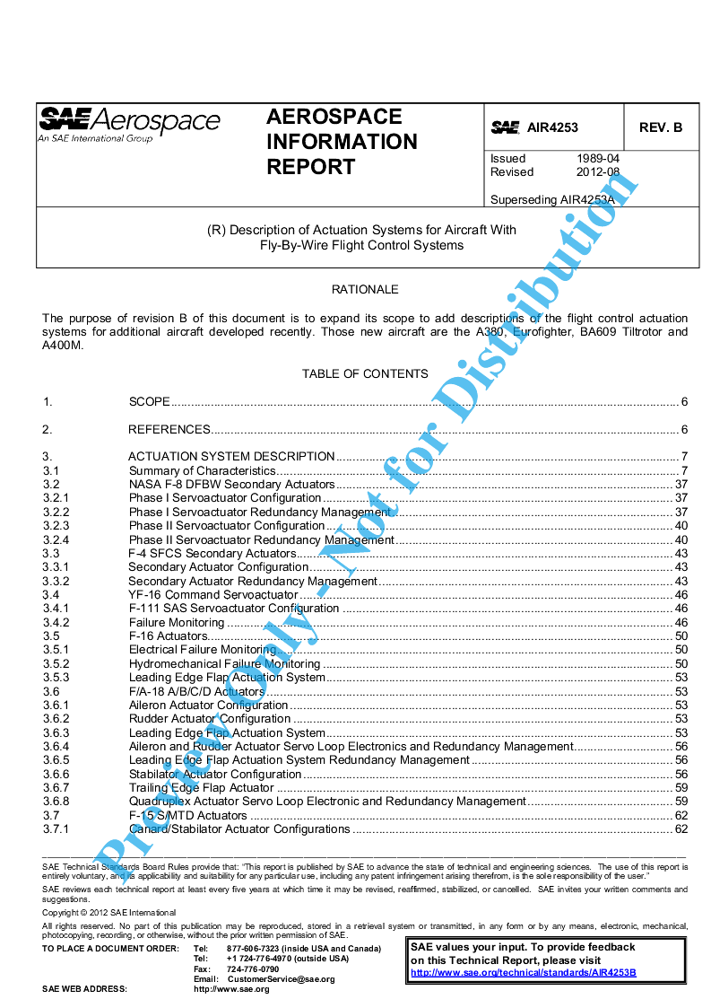 This SAE Aerospace Information Report (AIR) provides design information of various contemporary aircraft fly-by-wire (FBW) flight control actuation systems that may be useful in the design of future systems for similar applications. It is primarily applicable to manned aircraft. It presents the basic characteristics, hardware descriptions, redundancy concepts, functional schematics, and discussions of the servo controls, failure monitoring, and fault tolerance. All existing FBW actuation systems are not described herein; however, those most representing the latest designs are included. While this AIR is intended as a reference source of information for aircraft actuation system designs, the exclusion or omission of any other appropriate actuation system or subsystem should not limit consideration of their use on future aircraft.