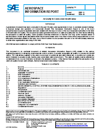This SAE Aerospace Information Report (AIR) provides information on air quality and some of the factors affecting the perception of cabin air quality in commercial aircraft cabin air. Also a typical safety analysis process utilizing a Functional Hazard Assessment approach is discussed.