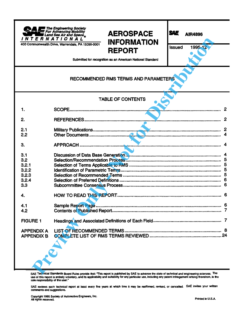 Accordingly, in early 1986 the SAE G-11R (Resources) subcommittee was formed and tasked to review relevant RMS documents, extract any applicable terms, and through a system of logical selection compile a series of terms and definitions that would be recommended for the Aerospace Community. There are undoubtedly many more documents that need to be reviewed for the definitions they contain, for example, we have specifically excluded “software reliability” from this edition. Also, there is a need to reconcile the terms and their definitions with those commonly used in the commercial aircraft business. It is planned that the SAE subcommittee work shall continue to result in future revisions that will broaden the scope of the document. This is the document that has been prepared by the SAE G-11R subcommittee. Future updates of this document will continue to reflect the converging of defense and commercial technology and standards.