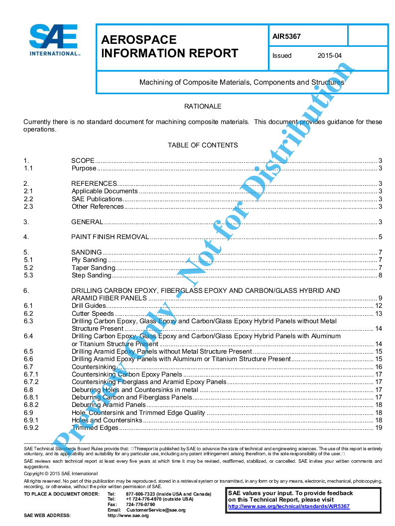This SAE Aerospace Information Report (AIR) provides information related to machining of composite materials, components and structures. This document is intended to supplement the machining processes and guidelines provided in OEM repair manuals and structural repair manuals. It is not intended to supersede the approved data provided in OEM repair documents.