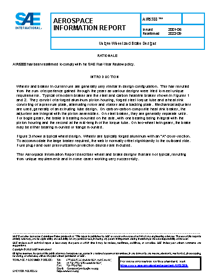 This SAE Aerospace Information Report (AIR) has been prepared by a panel of the SAE A-5A Committee and is presented to document unique design approaches used for aircraft wheels and brakes.