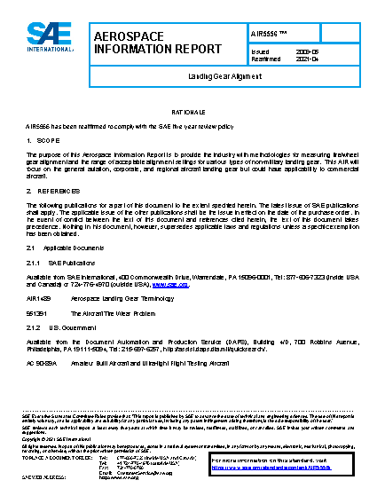 The purpose of this Aerospace Information Report is to provide the industry with methodologies for measuring tire/wheel gear alignment and the range of acceptable alignment settings for various types of non-military landing gear. This AIR will focus on the general aviation, corporate, and regional aircraft landing gear but could have applicability to commercial aircraft.