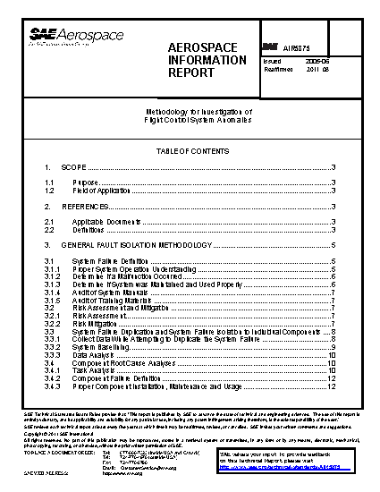 This SAE Aerospace Information Report (AIR) outlines comprehensive aircraft flight control system fault isolation methodology that has proven to be effective. The methodology presented in this Information Report has been used in several successful fault isolation efforts on military aircraft.