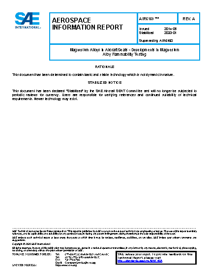 This document provides informational background, rationale and a technical case to allow consideration of the removal of the magnesium alloy restriction in aircraft seat construction as contained in AS8049B. The foundation of this argument is flammability characterization work performed by the FAA at the William J. Hughes Technical Center (FAATC), Fire Safety Branch in Atlantic City, New Jersey, USA. The rationale and detailed testing results are presented along with flammability reports that have concluded that the use of specific types of magnesium alloys in aircraft seat construction does not increase the hazard level potential in the passenger cabin in a post-crash fire scenario. Further, the FAA has developed a lab scale test method, reference DOT/FAA/TC-13/52, to be used as a certification test, or method of compliance (MOC) to allow acceptability of the use of magnesium in the governing TSO-C127 and TSO-C39C.