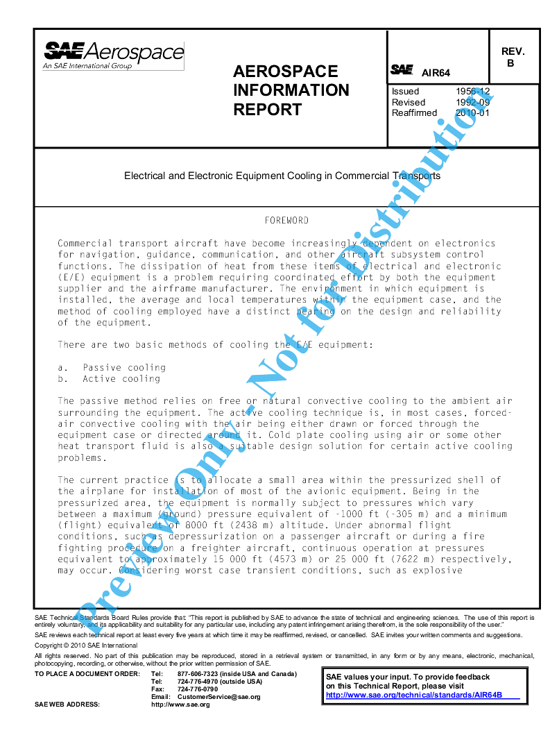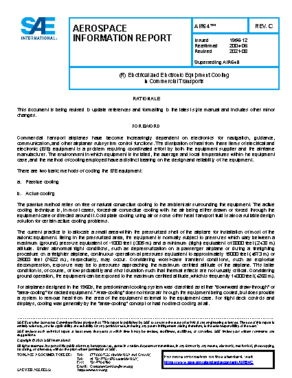 This document considers the cooling of equipment installed in equipment centers, which usually consist of rack-mounted equipment and panel mounted equipment in the flight deck. In instances where these two locations result in different requirements, these are identified. For purposes of this document, the cooled equipment is referred to generally as E/E equipment, denoting that both electrical and electronic equipment is considered, or as an E/E equipment line-replaceable-unit (LRU). The majority of cooled equipment takes the form of LRUs. This document primarily relates to E/E equipment which is designed to use forced air cooling in order to maintain the equipment within acceptable environmental limits, in order to maintain equipment operating performance (within acceptable tolerances), and to maintain reliability. Cooling may be applied internally or externally to the case of the item of E/E equipment. There are also E/E equipment items which are cooled by natural convection, conduction, and radiation to the surrounding environment.