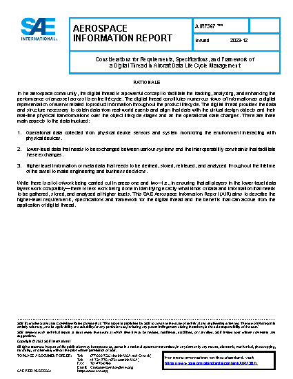 The scope of this SAE Aerospace Information Report (AIR) is to describe the considerations for requirements, specifications, and framework of digital thread in the aircraft product life cycle management. This document is not intended to define an overarching rendition of implementation-dependent features around software or architecture.