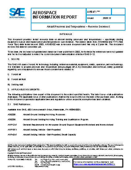 This SAE AIR covers Forced Air technology including: reference material, equipment, safety, operation, and methodology. It is intended to provide pressure and temperature (temps pages 26 & 31) information and minimum safety guidelines regarding use of equipment to remove frozen contaminants related to: