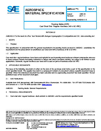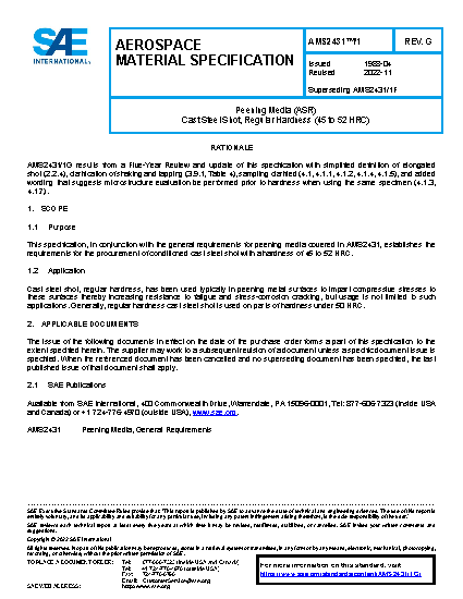This specification, in conjunction with the general requirements for peening media covered in AMS2431, establishes the requirements for the procurement of conditioned cast steel shot with a hardness of 45 to 52 HRC.