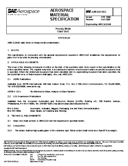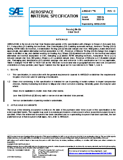 This specification, in conjunction with the general requirements covered in AMS 2431 establishes the requirements for glass shot to be used for peening of metal parts.