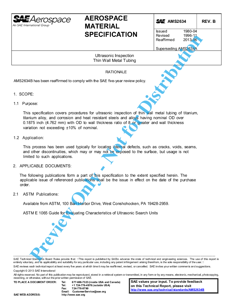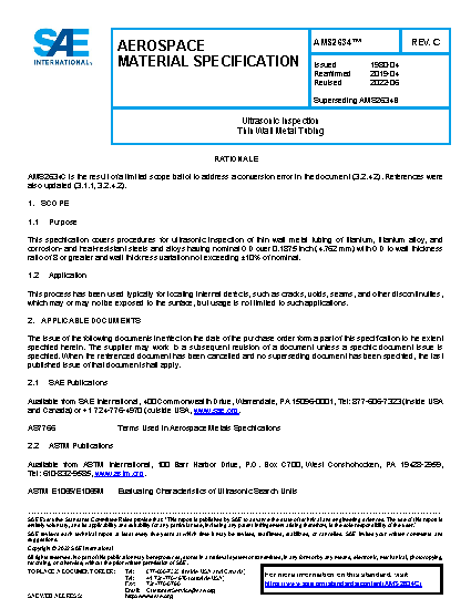 This specification covers procedures for ultrasonic inspection of thin wall metal tubing of titanium, titanium alloy, and corrosion and heat resistant steels and alloys having nominal OD over 0.1875 inch (4.762 mm) with OD to wall thickness ratio of 8 or greater and wall thickness variation not exceeding ±10% of nominal.