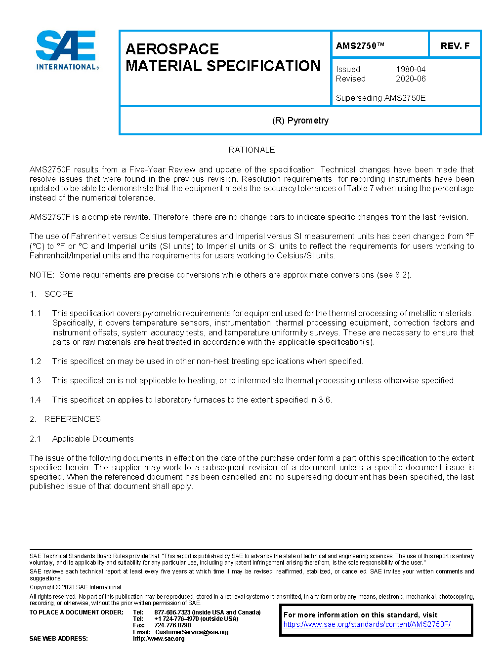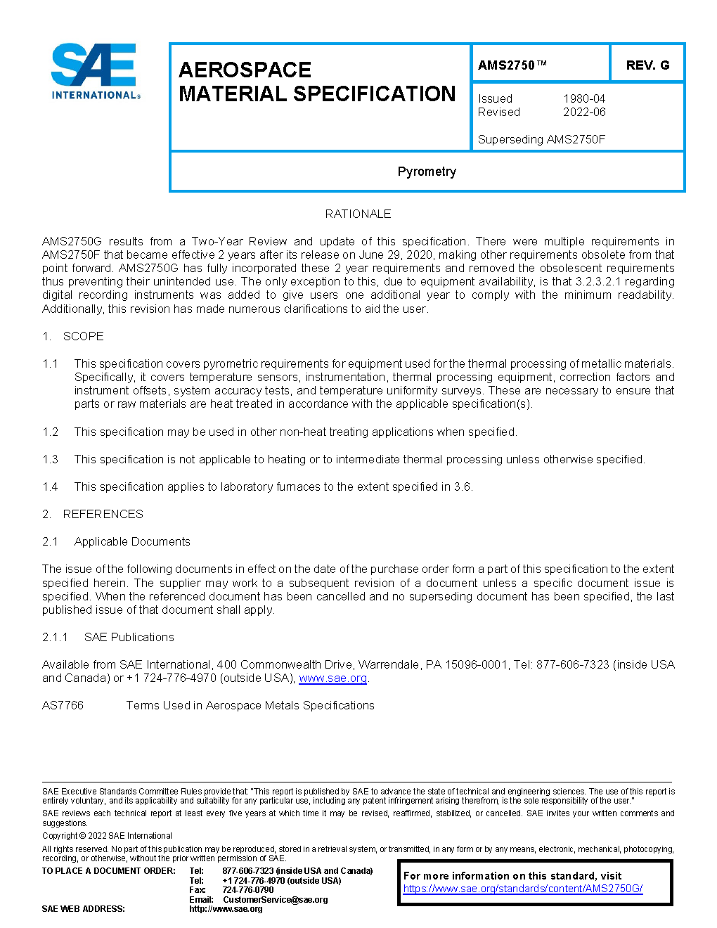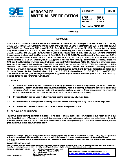 This specification covers pyrometric requirements for thermal processing equipment used for heat treatment. It covers temperature sensors, instrumentation, thermal processing equipment, system accuracy tests, and temperature uniformity surveys. These are necessary to ensure that parts or raw materials are heat treated in accordance with the applicable specification(s).