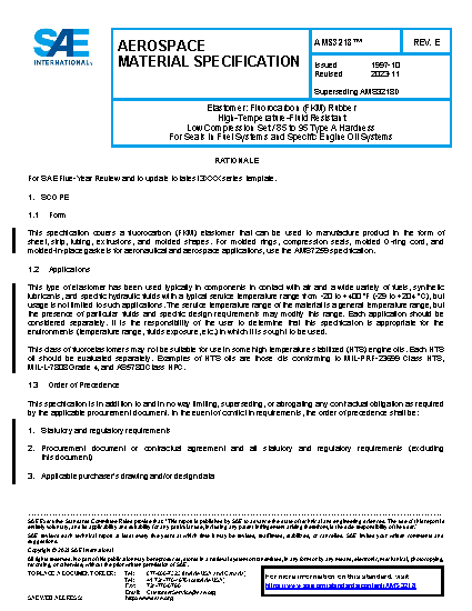 This specification covers a fluorocarbon (FKM) elastomer that can be used to manufacture product in the form of sheet, strip, tubing, extrusions, and molded shapes. For molded rings, compression seals, O-ring cord, and molded-in-place gaskets for aeronautical and aerospace applications, use the AMS7259 specification.