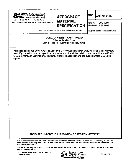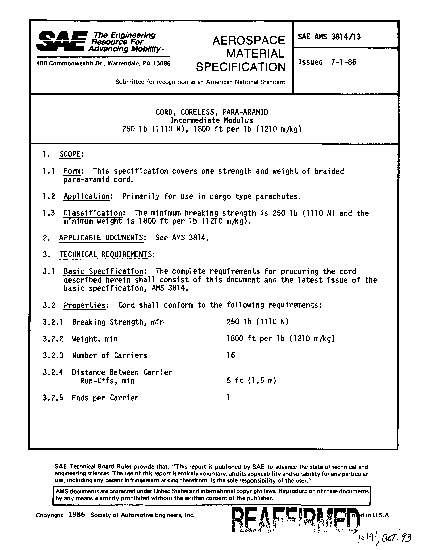 CORD, CORELESS, PARA-ARAMID Intermediate Modulus 250 lb (1110 N), 1800 ft per lb (1210 m/kg)
