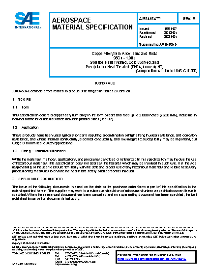 Copper-Beryllium Alloy, Bars and Rods 98Cu - 1.9Be Solution Heat Treated, Cold Worked, and Precipitation Heat Treated (TH04, formerly HT)