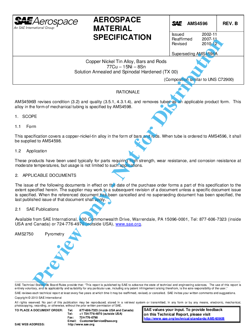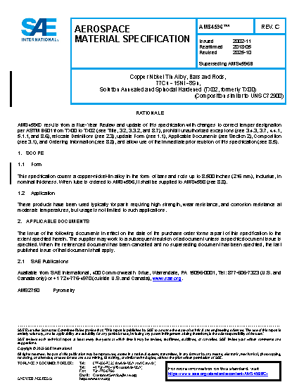 This specification covers a copper-nickel-tin alloy in the form of bars and rods. When tube is ordered to AMS4596, it shall be supplied to AMS4598.