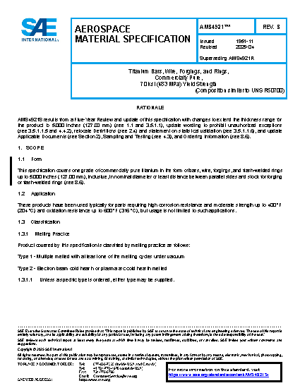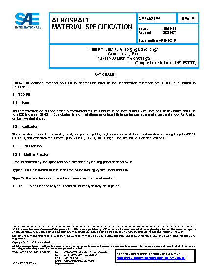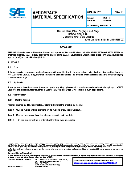 Titanium Bars, Wire, Forgings, and Rings Commercially Pure 70 ksi (483 MPa) Yield Strength