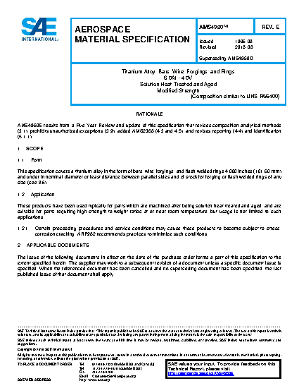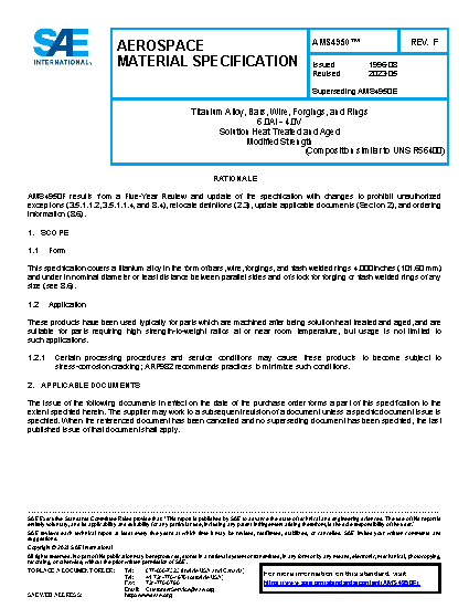 This specification covers a titanium alloy in the form of bars, wire, forgings, and flash welded rings 4.000 inches (101.60 mm) and under in nominal diameter or least distance between parallel sides and of stock for forging or flash welded rings of any size (see 8.6).
