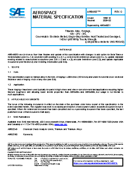 This specification covers a titanium alloy in the form of forgings 4.00 inches (101.6 mm) and under in nominal cross-sectional thickness and of forging stock of any size.