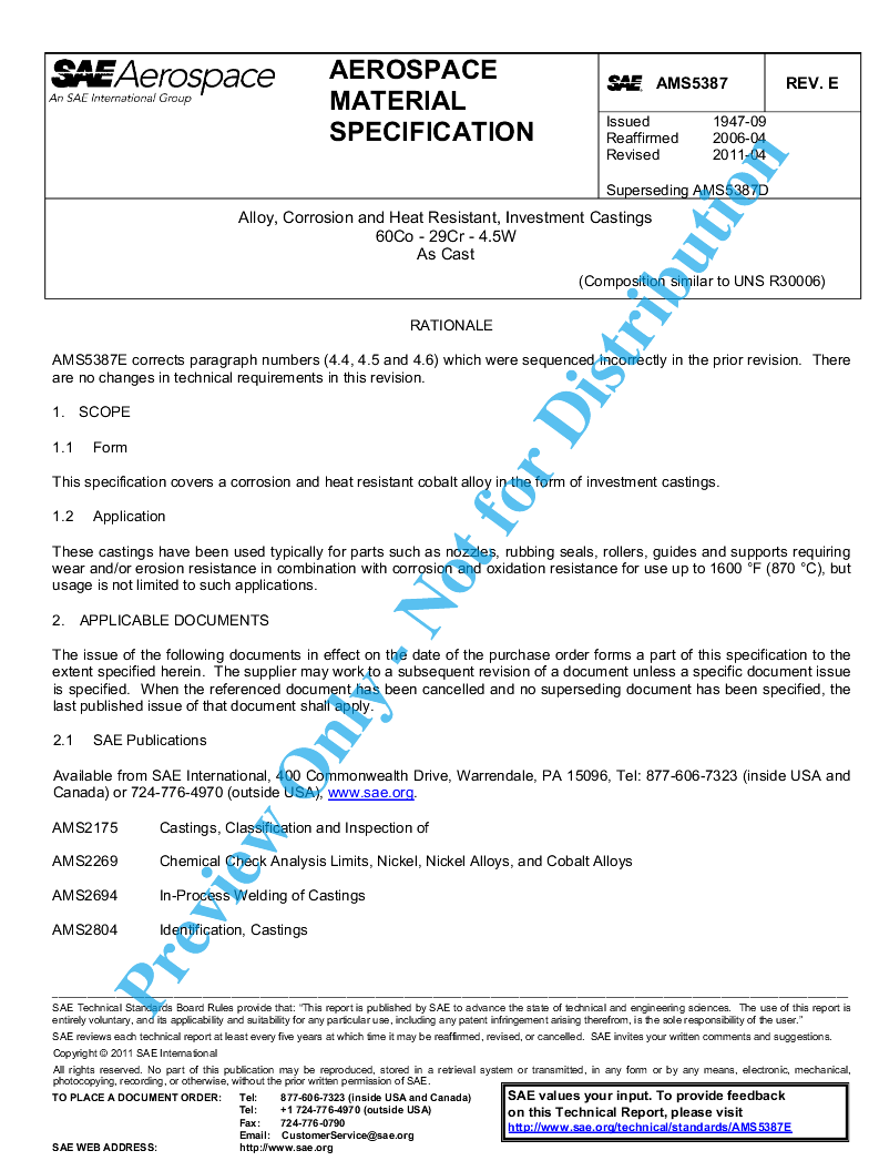 This specification covers a corrosion and heat resistant cobalt alloy in the form of investment castings.