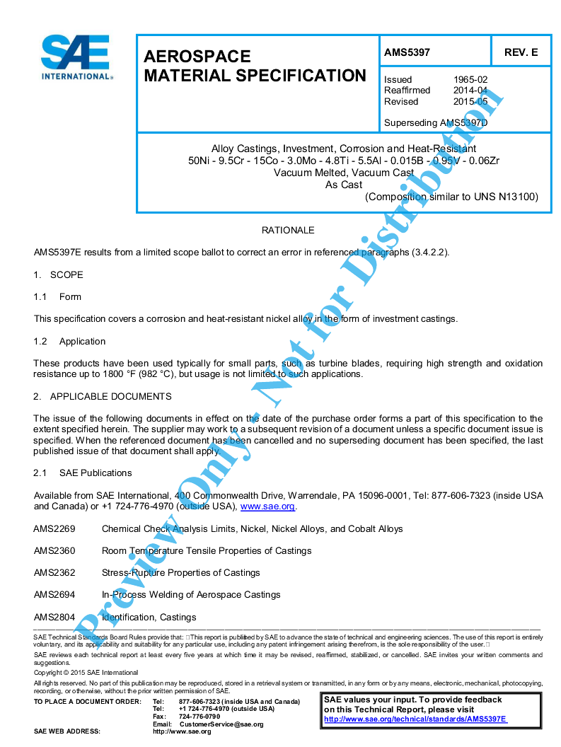 This specification covers a corrosion and heat-resistant nickel alloy in the form of investment castings.