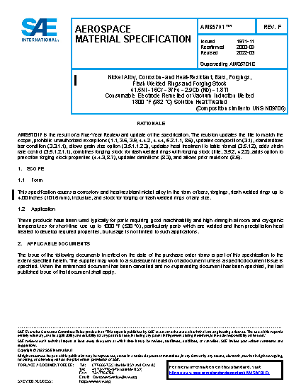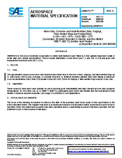 This specification covers a corrosion- and heat-resistant nickel alloy in the form of bars, forgings, flash welded rings up to 4.00 inches (101.6 mm), inclusive, and stock for forging or flash welded rings of any size.