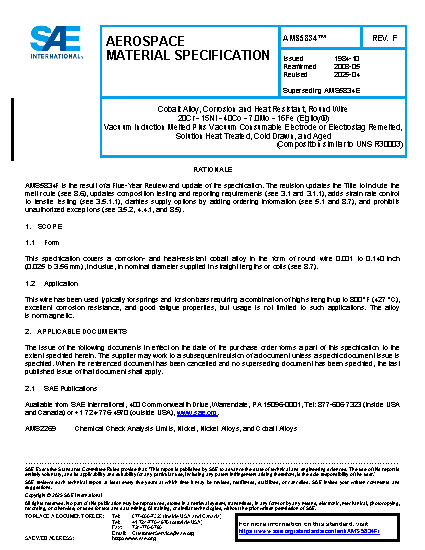This specification covers a corrosion and heat-resistant cobalt alloy in the form of round wire 0.140 inch (3.56 mm) and under in nominal diameter supplied in straight lengths. (See 8.5.)