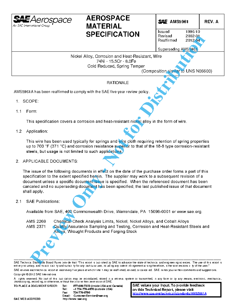 This specification covers a corrosion and heat-resistant nickel alloy in the form of wire.