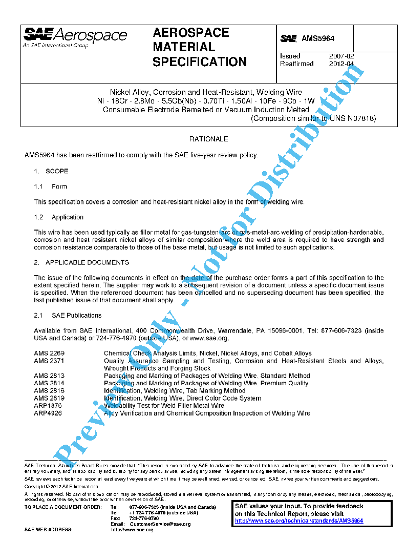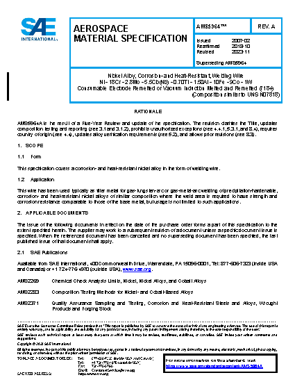 This specification covers a corrosion and heat-resistant nickel alloy in the form of welding wire.