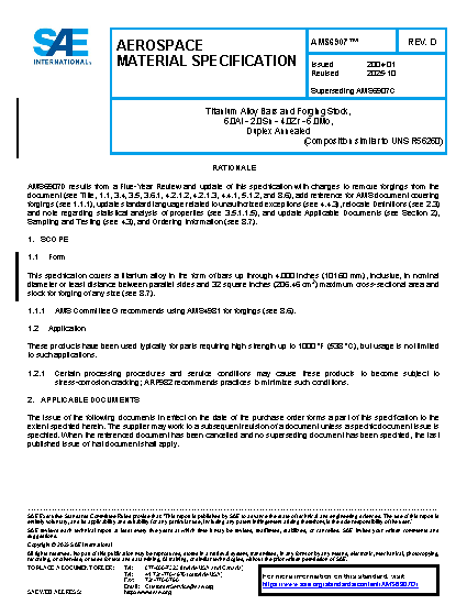 This specification covers a titanium alloy in the form of bars, forgings up through 4.000 inches (101.60 mm), inclusive in nominal diameter or least distance between parallel sides and 32 in2 (206.46 cm2) maximum cross sectional area, and stock for forging of any size.