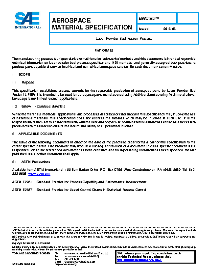 This specification establishes process controls for the repeatable production of aerospace parts by Laser Powder Bed Fusion (L-PBF). It is intended to be used for aerospace parts manufactured using Additive Manufacturing (AM) metal alloys, but usage is not limited to such applications.