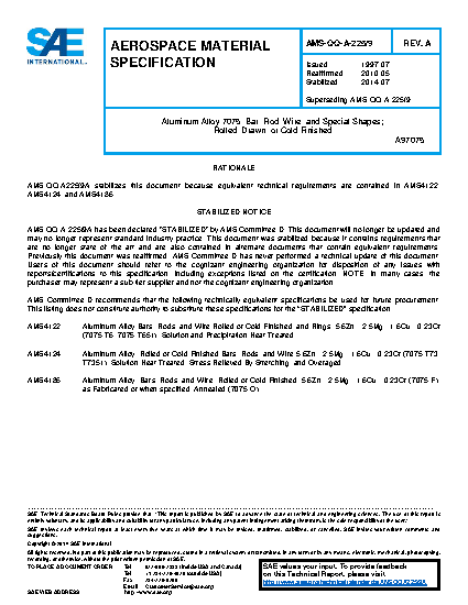 Aluminum Alloy 7075, Bar, Rod, Wire, and Special Shapes; Rolled, Drawn, or Cold Finished (Stabilized: Jul 2014)