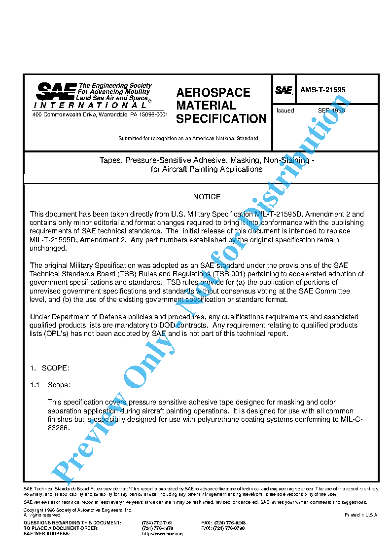 Tapes, Pressure-Sensitive Adhesive, Masking, Non-Staining - for Aircraft Painting Applications