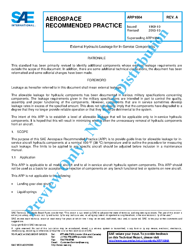 The purpose of this SAE Aerospace Recommended Practice (ARP) is to provide guide lines for allowable leakage for in-service aircraft hydraulic components at a nominal 100 °F (38 °C) temperature and to outline the procedure for measuring such leakage. The limits to be applied to any specific aircraft should be adjusted before inclusion in a maintenance manual.
