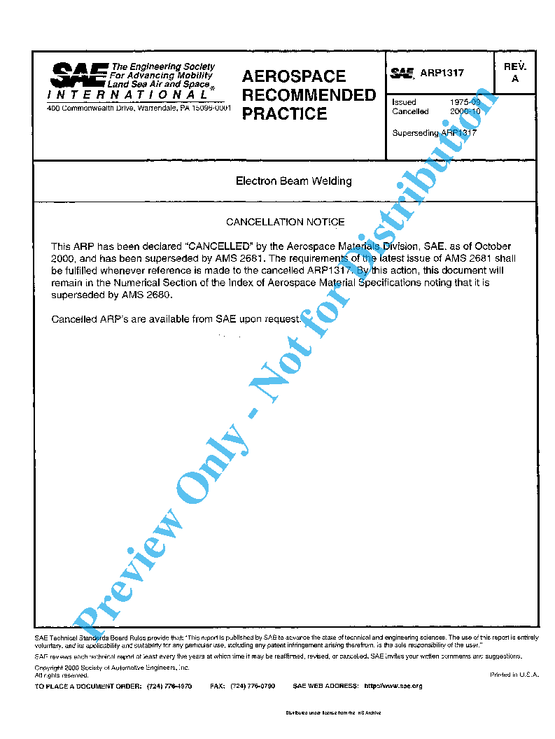 This Aerospace Recommended Practice (ARP) describes techniques recommended for use in producing electron beam welded joints in materials commonly employed in the aerospace industry. The guidelines described herein are oriented toward the use of welding equipment capable of maintaining the workpiece at pressure levels of 1 x 10(sup)-4 Torr (133 x 10(sup)-4 Pa) or lower during welding.