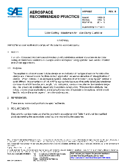 This SAE Aerospace Recommended Practice (ARP) establishes uniform requirements for color coding of elastomeric cushions on clamps used in aerospace tubing systems, wire bundle retention, and similar applications.