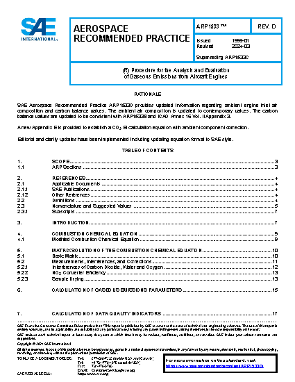 SAE Aerospace Recommended Practice ARP1533 is a procedure for the analysis and evaluation of the measured composition of the exhaust gas from aircraft engines. Measurements of carbon monoxide, carbon dioxide, total hydrocarbon, and the oxides of nitrogen are used to deduce emission indices, fuel-air ratio, combustion efficiency, and exhaust gas thermodynamic properties. The emission indices (EI) are the parameters of critical interest to the engine developers and the atmospheric emissions regulatory agencies because they relate engine performance to environmental impact.