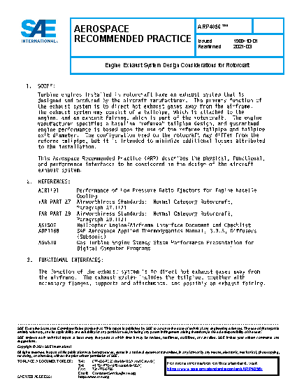 This Aerospace Recommended Practice (ARP) describes the physical, functional, and performance interfaces to be considered in the design of the aircraft exhaust system.