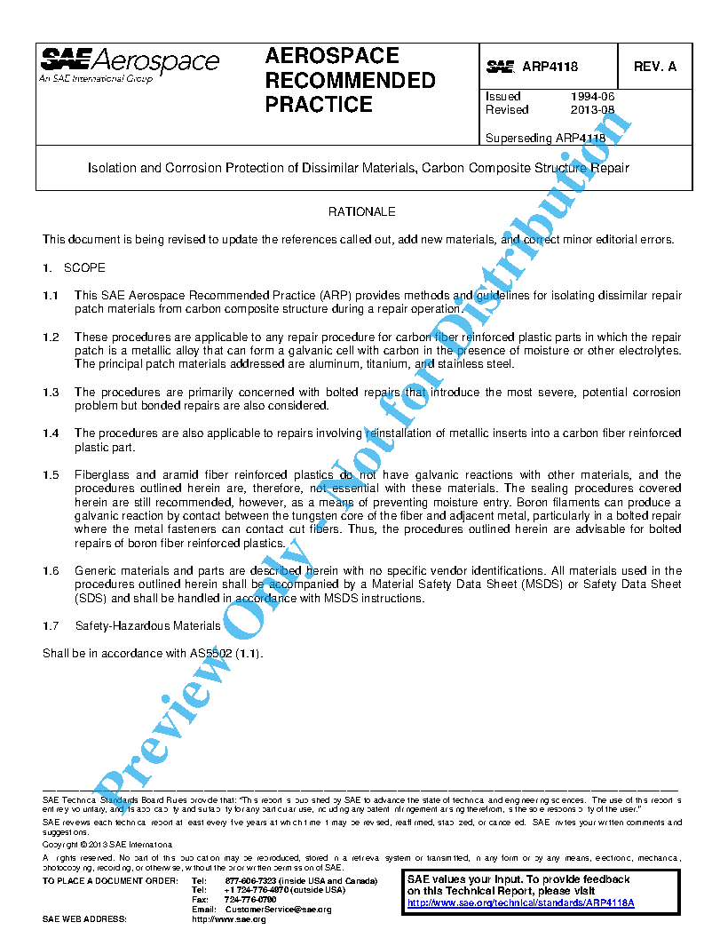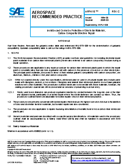 This SAE Aerospace Recommended Practice (ARP) provides methods and guidelines for isolating dissimilar repair patch materials from carbon composite structure during a repair operation.