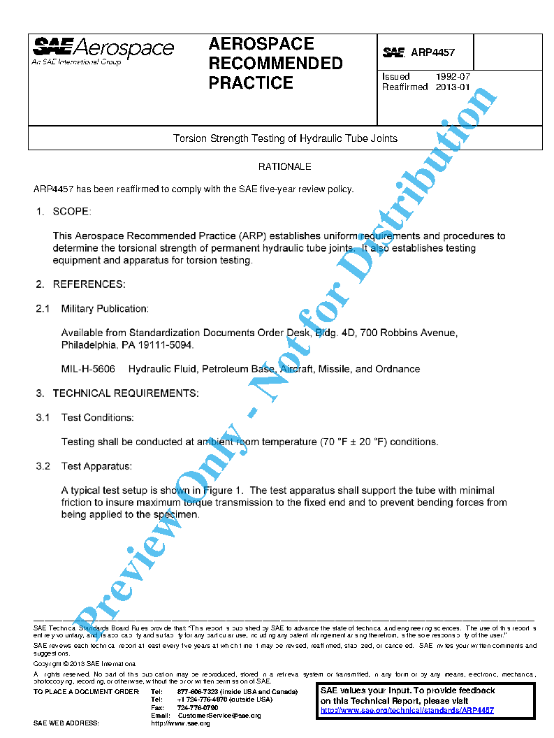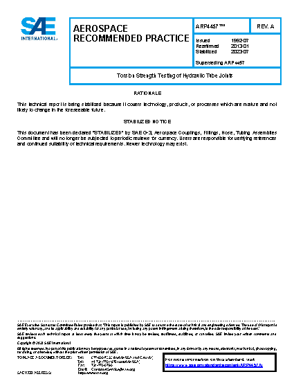 This Aerospace Recommended Practice (ARP) establishes uniform requirements and procedures to determine the torsional strength of permanent hydraulic tube joints. It also establishes testing equipment and apparatus for torsion testing.