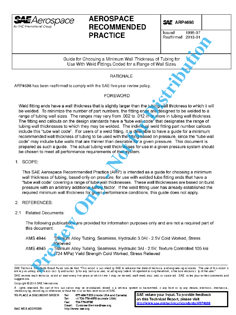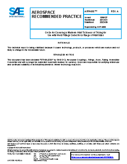 This SAE Aerospace Recommended Practice (ARP) is intended as a guide for choosing a minimum wall thickness of tubing, based only on pressure, for use with welded tube fitting ends that have a “tube wall code” covering a range of tube wall thicknesses. These wall thicknesses are based on burst pressure with an arbitrary additional safety factor. If the weld fitting user has already established the required minimum wall thickness for given performance conditions, this guide does not apply.