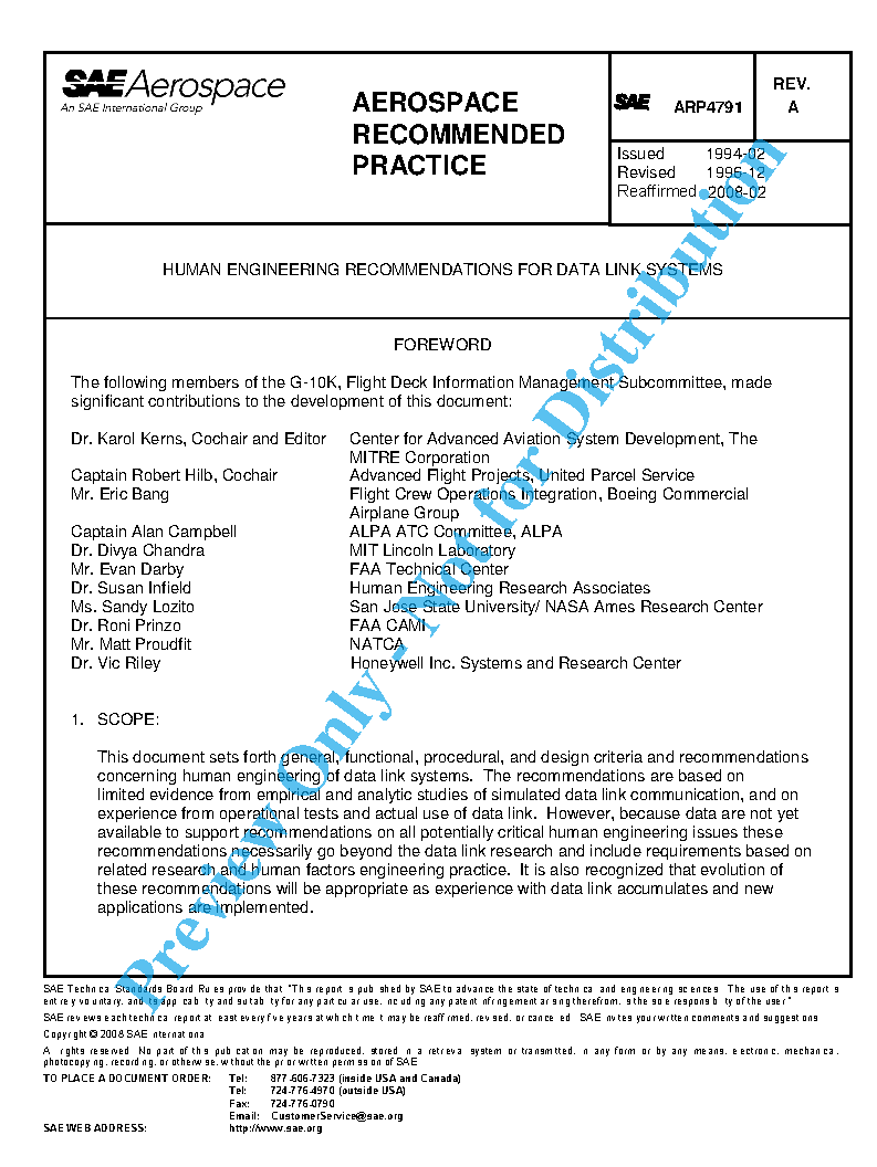 This document is intended as a guide for development and evaluation of data link systems. Human engineering considerations are an important element of data link system performance. As illustrated in Figure 1, human engineering recommendations address many component functions required for effective data link communication services in the operational environment. For presentation purposes, the recommendations are divided into five sections: General, functional, procedures, flight deck/air traffic service (ATS) workstation integration, and human-computer interface. To facilitate understanding and use of this document appropriate cross-references to interrelated recommendations appear in parentheses throughout the text.