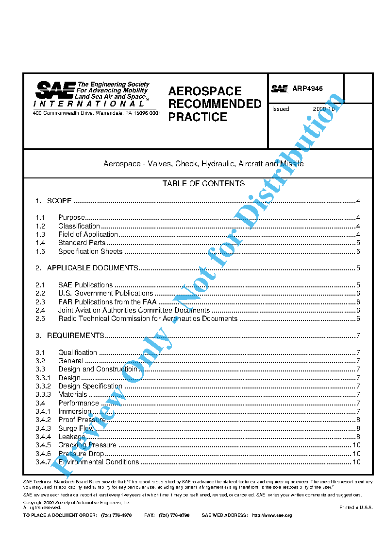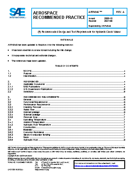 This SAE Aerospace Recommended Practice (ARP) establishes the general requirements for spring-loaded, normally closed check valves for use in Type I, Type II, or Type III aircraft and missile hydraulic systems having nominal operating pressure shown in Table 1.